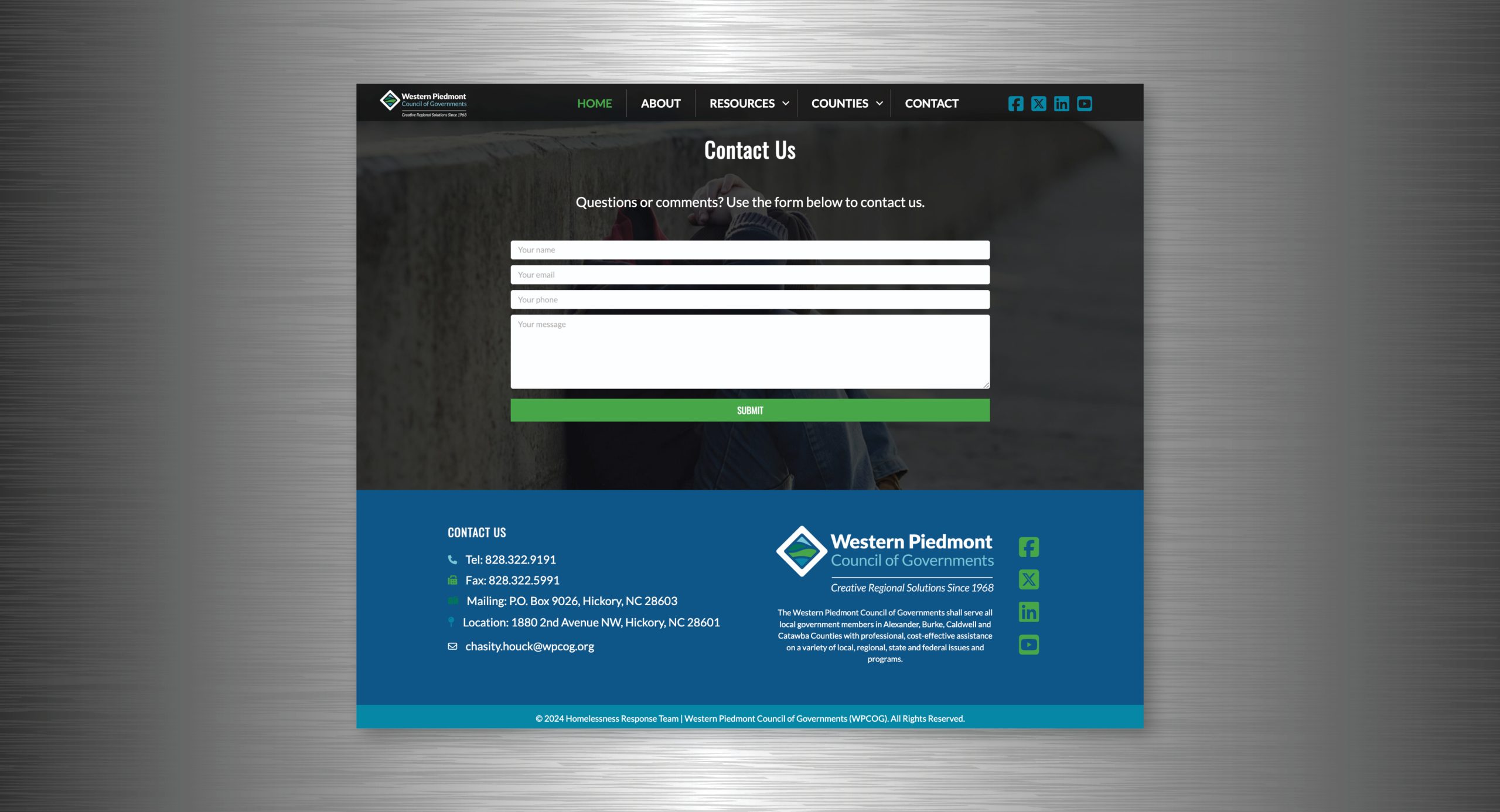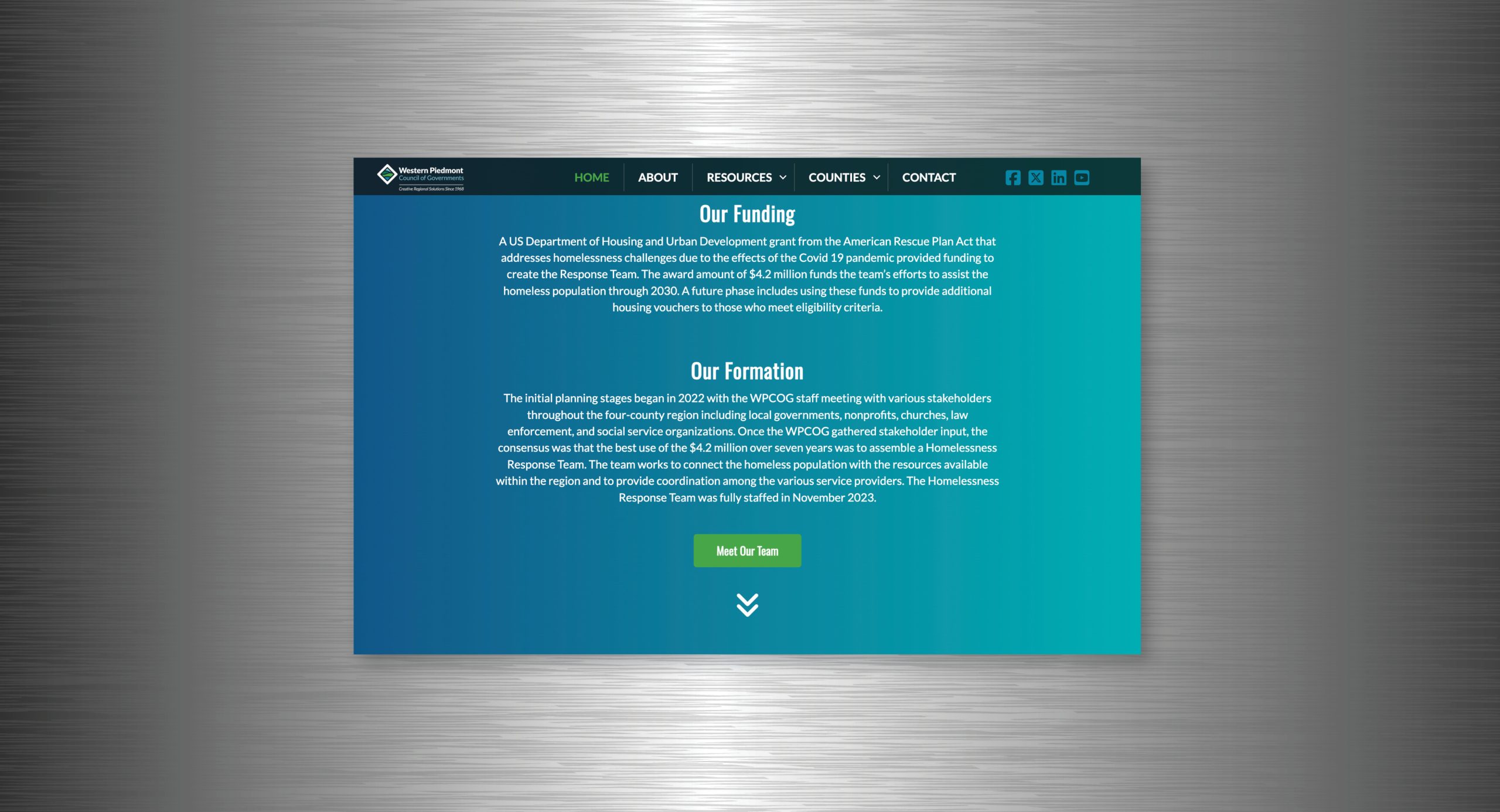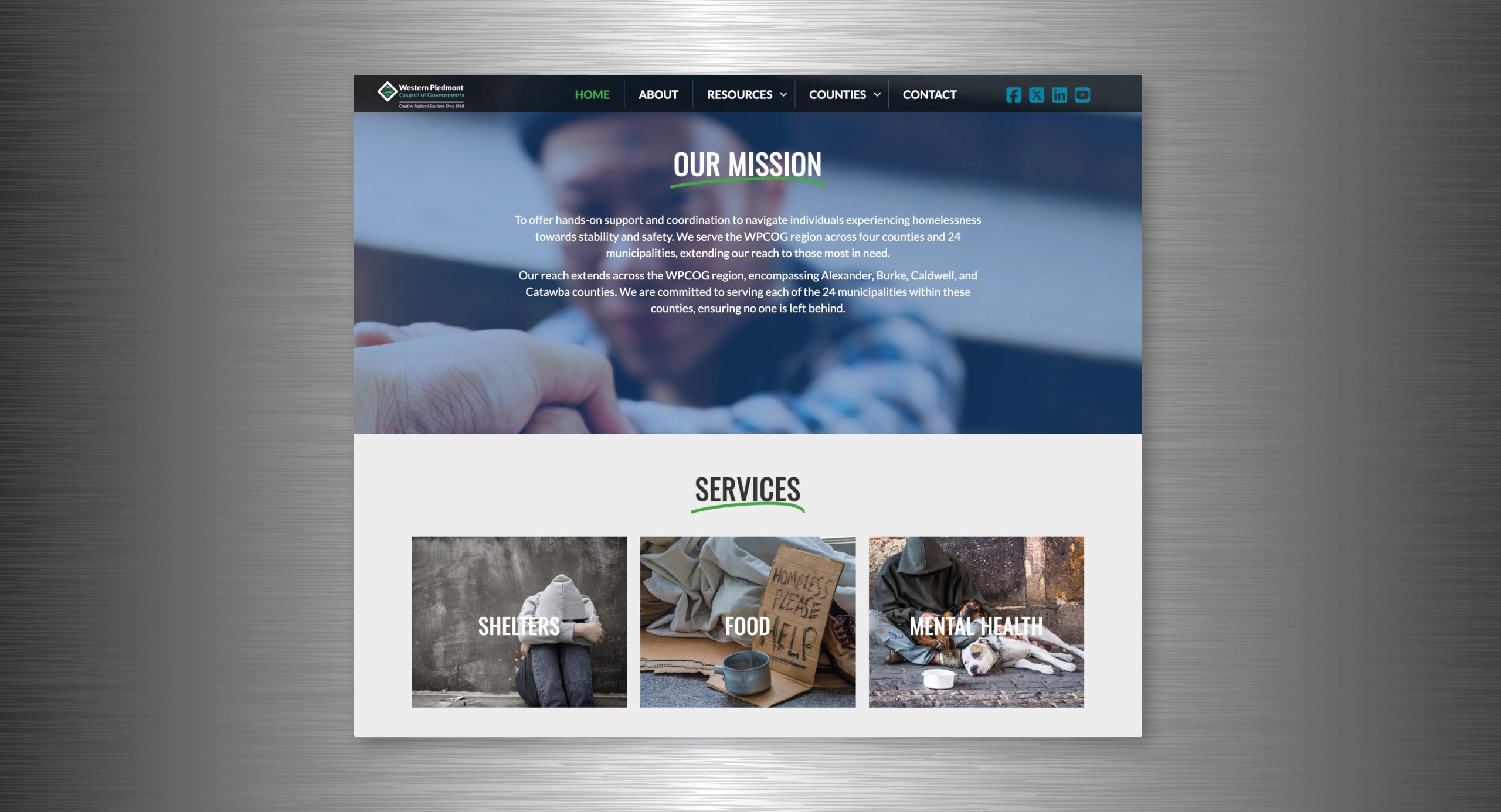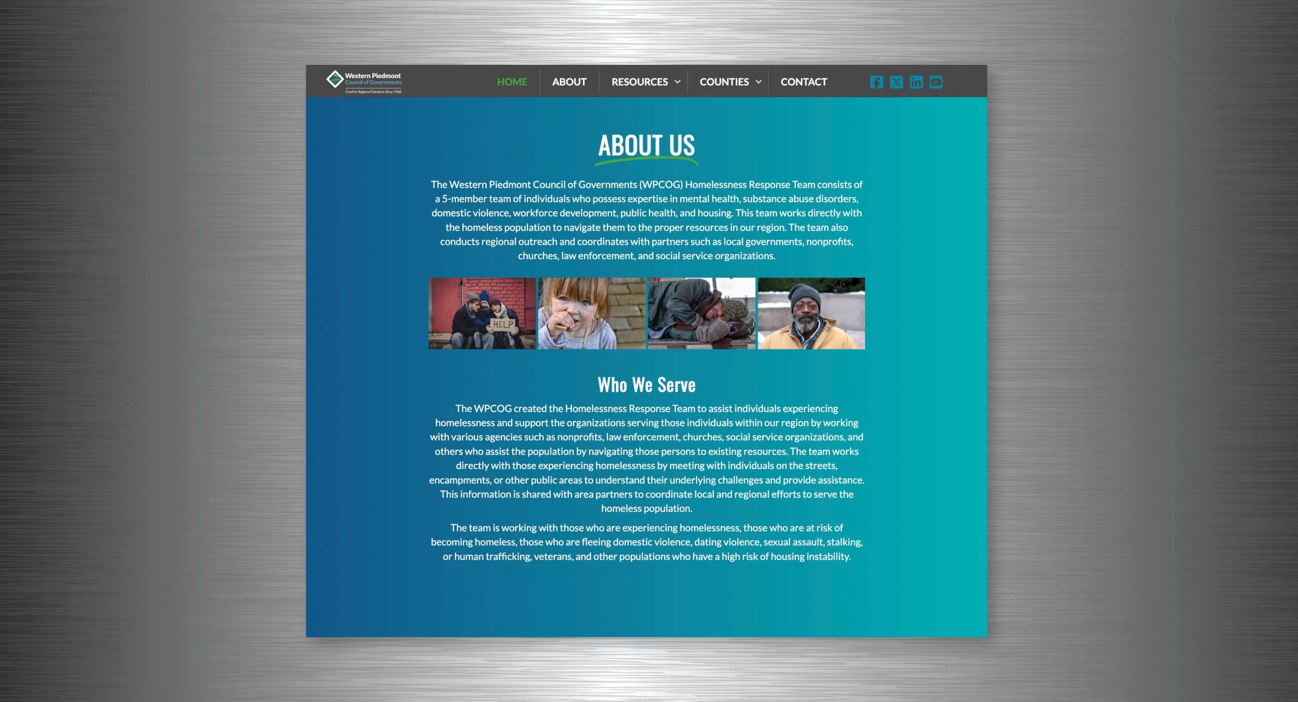 The Western Piedmont Council of Governments (WPCOG) established the Homelessness Response Team to provide support and coordination for individuals experiencing homelessness. This website outlines the team’s mission to guide individuals toward safety and stability across the WPCOG region, including four counties and 24 municipalities. The website’s design is clean, user-friendly, and accessible, with clear navigation and impactful visuals that highlight the team’s efforts, ensuring visitors can easily find the resources and information they need.
